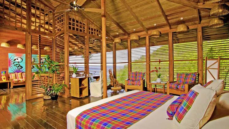 Anse Chastanets originelle Räume, Badezimmer und tropisches Hartholzmobiliar wurden individuell durch den Architekten und Besitzer gestaltet, und verschmelzen harmonisch mit der Umgebung und der Natur. Anse Chastanets spezielle Philosophie: Es gibt keinen Fernseher, Radio, oder Telefone in den Zimmern, absichtlich, „damit die Außenwelt auch draußen bleibt“.